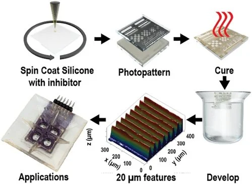 140 - Samuel J. Edmunds, Noel Sebastien D. Mallari, Marc N. Levy, Qinyu Liang, Anum Tahir, Dhivya Pushpa Meganathan, Lisa Tang, Leah Sadr, Jacqueline Lampert, Wade Shipley, Hannah E. Fishman, Rafael A. Montalvo, Tarek Rafeedi, Abdulhameed Abdal, Tse Nga Ng, Jinhye Bae, Andrea R. Tao, Nathan A. Romero, Zeinab Jahed, and Darren J. Lipomi 2026. Simple Method for Photopatterning Commercial PDMS Using an Off-the-Shelf Photodeactivated Hydrosilylation Inhibitor. ACS Applied Polymer Materials. DOI: 10.1021/acsapm.5c04718.